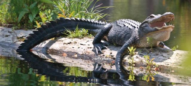Female American alligators (Alligator mississippiensis) inhabit the southeastern United States, Alligators are long lived animals, whose life can exceed 60 years. Alligators are cold-blooded, they are frequently observed on the banks of water bodies on hot days, they can see with their mouths open, I catch at Cypress garden Charleston SC