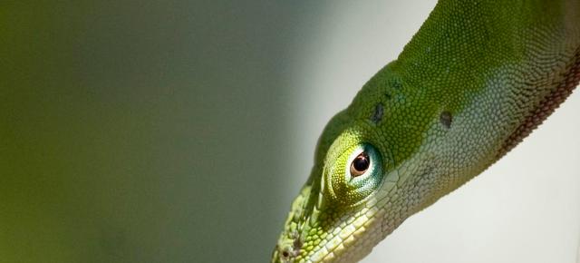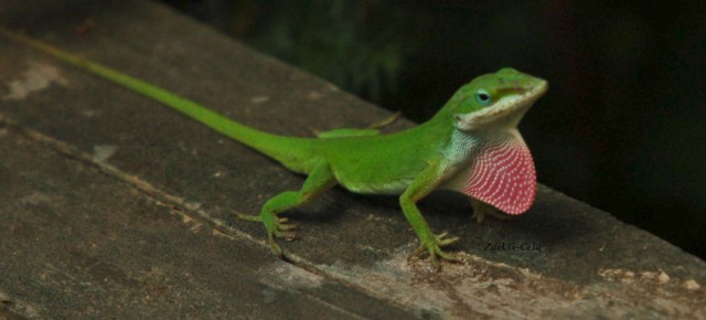 Green Anole (Anolis carolinensis), Green, with pink throat fan, can change the color rapidly. Macro photo on my garden