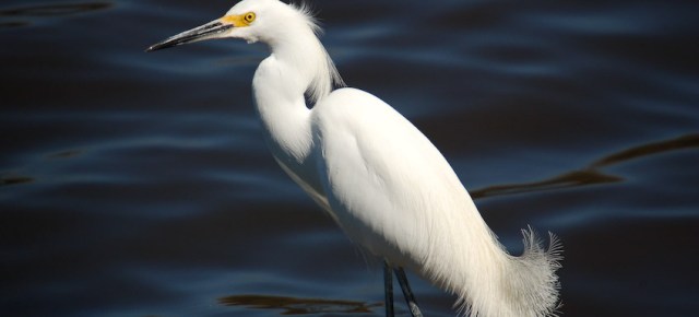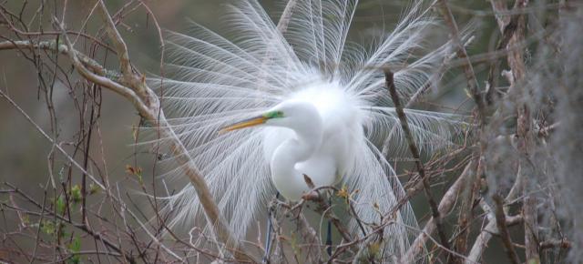 Great Egret Ardea alba, with heavy yellow bill, black legs and feet, In breading plumage, Spring time at Magnolia Plantation,Charleston SC