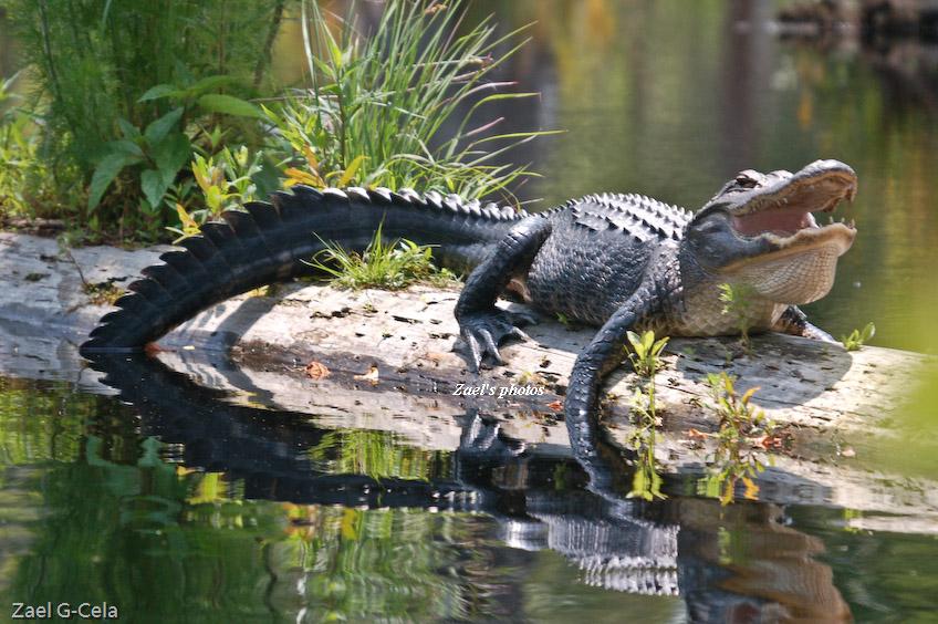 Female American alligators (Alligator mississippiensis) inhabit the southeastern United States, Alligators are long lived animals, whose life can exceed 60 years. Alligators are cold-blooded, they are frequently observed on the banks of water bodies on hot days, they can see with their mouths open, I catch at Cypress garden Charleston SC